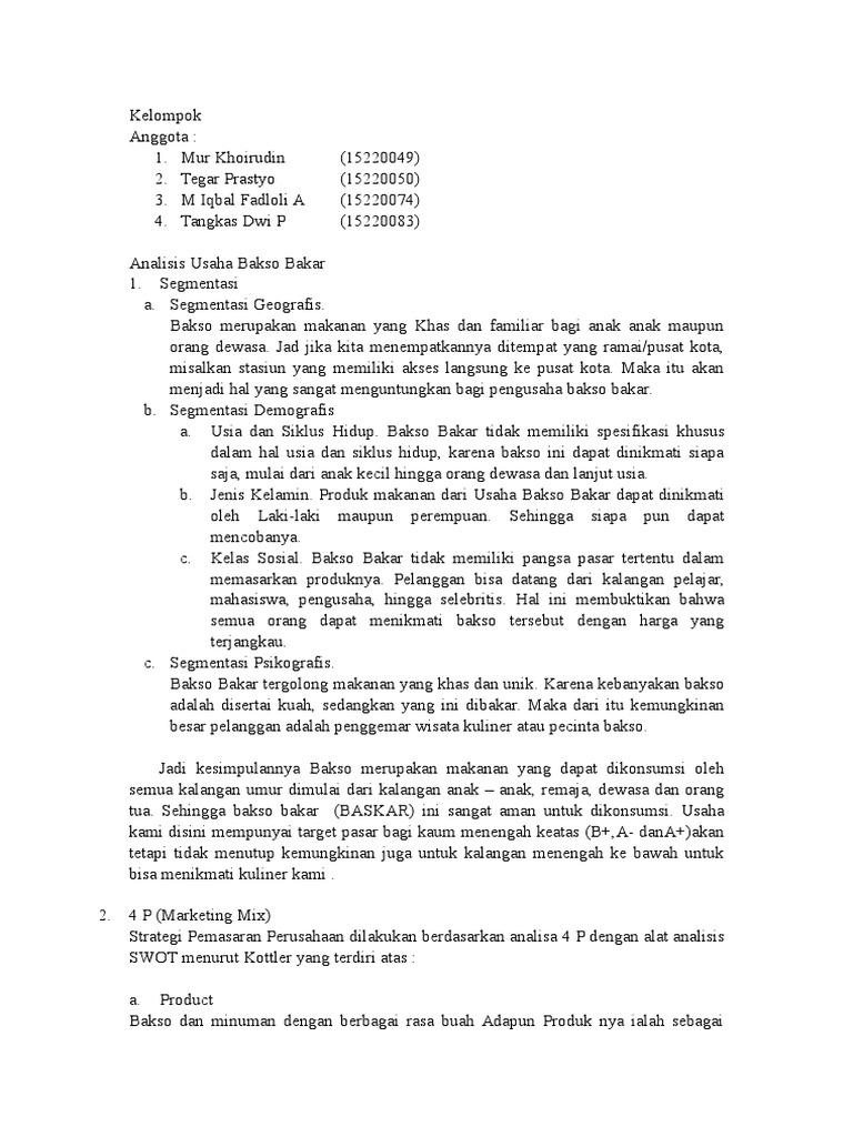 Produk Tentukan apa perbedaan bakso Anda dengan bakso yang lain. Segmentasi pasar sendiri pada dasarnya adalah mengidentifikasi menganalisa dan mengelompokkan calon pembeli dalam suatu pasar berdasar karakteristik kebutuhan atau perilaku tertentu. Segmentasi Perilaku Adanya acara TV yang meliput tentang usaha kami yaitu Benu Buloe Peppy The Explorer dan lainnyasehingga membuat lebih banyak pengunjung yg tertarik sehingga mencobaKonsep penjualannya yang unik dan belum di temukan di tempat lainMakanan dan minuman kami ini merupakan inovasi baru jadi belum dapat ditemukan di.